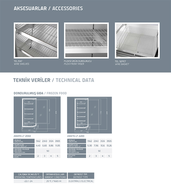 Description : Amatis LT, avec son système de porte en verre modulaire, crée un excellent équilibre entre le design et l’utilisation ergonomique. Même si les portes sont ouvertes à plusieurs reprises, Amatis NT conserve son économie d’énergie élevée et des caractéristiques longue durée de vie des aliments surgelés grâce à son système de verre chauffée et pelliculé.